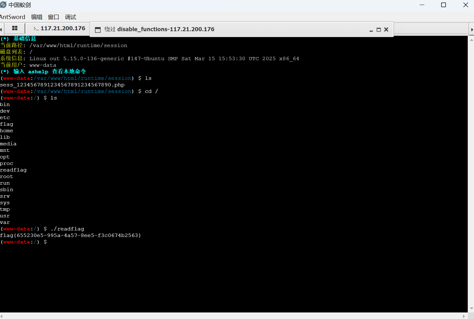 突破disable_functions函数的限制,用蚁剑插件然后选择PHP7 Backtrace UAF模式即可