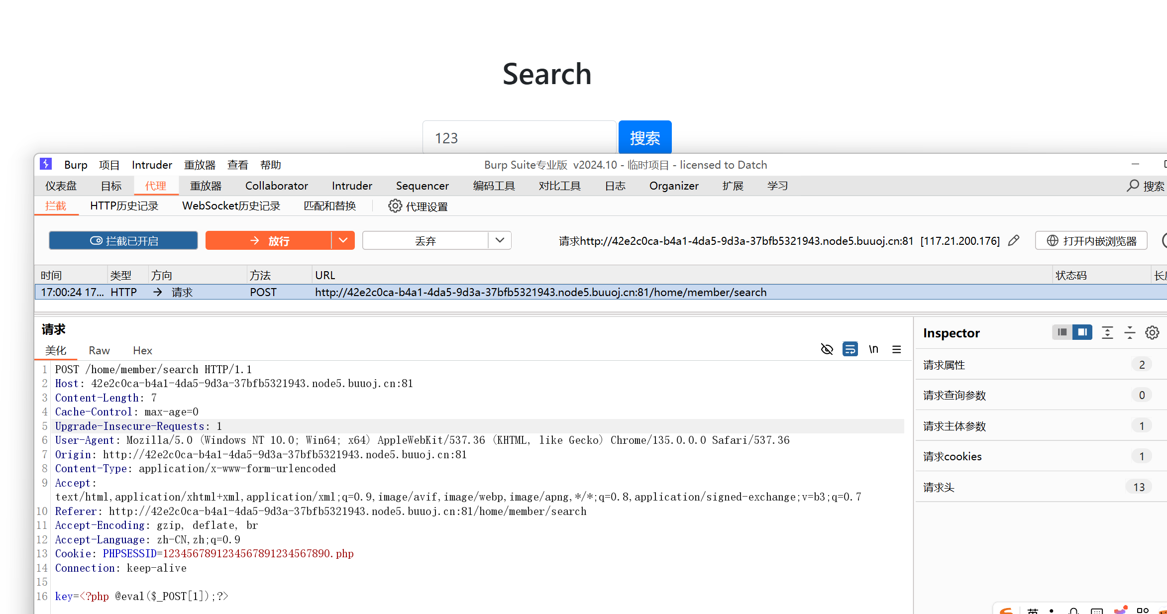 | login页面抓包,修改PHPSESSID的值为xxx.php,保持32位的长度 进入之后在搜索页面 存在一个post传参,我们搜索的值也就是key的值,会保存在 PHPSESSID文件中
