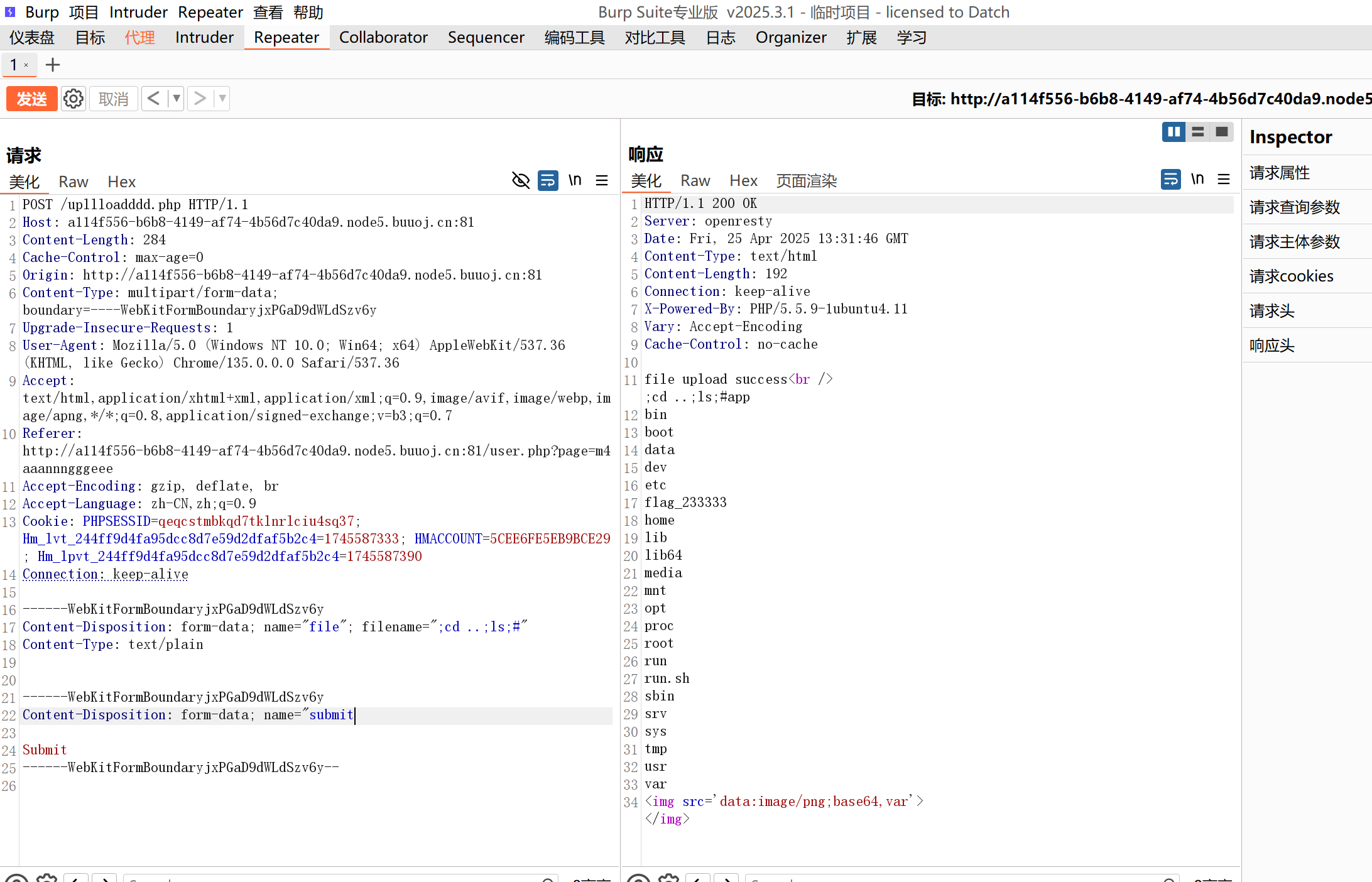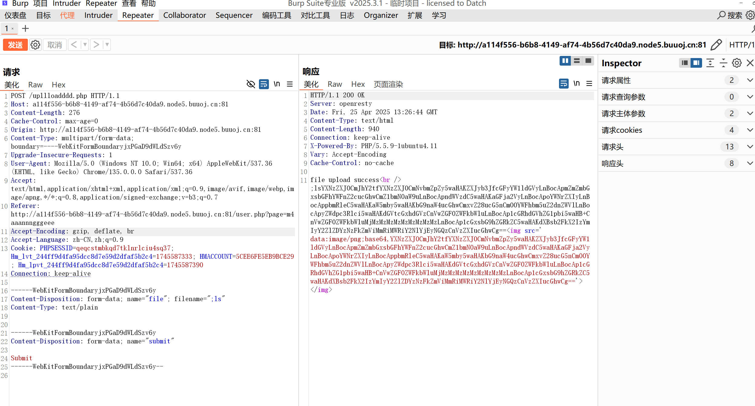 我们在这里上传然后抓包,修改filename为;ls试试,这里也可以改为;ls;#这样可以注释掉后面的base64编码语句,就不用我们去解码了,我这里用的是第一种。