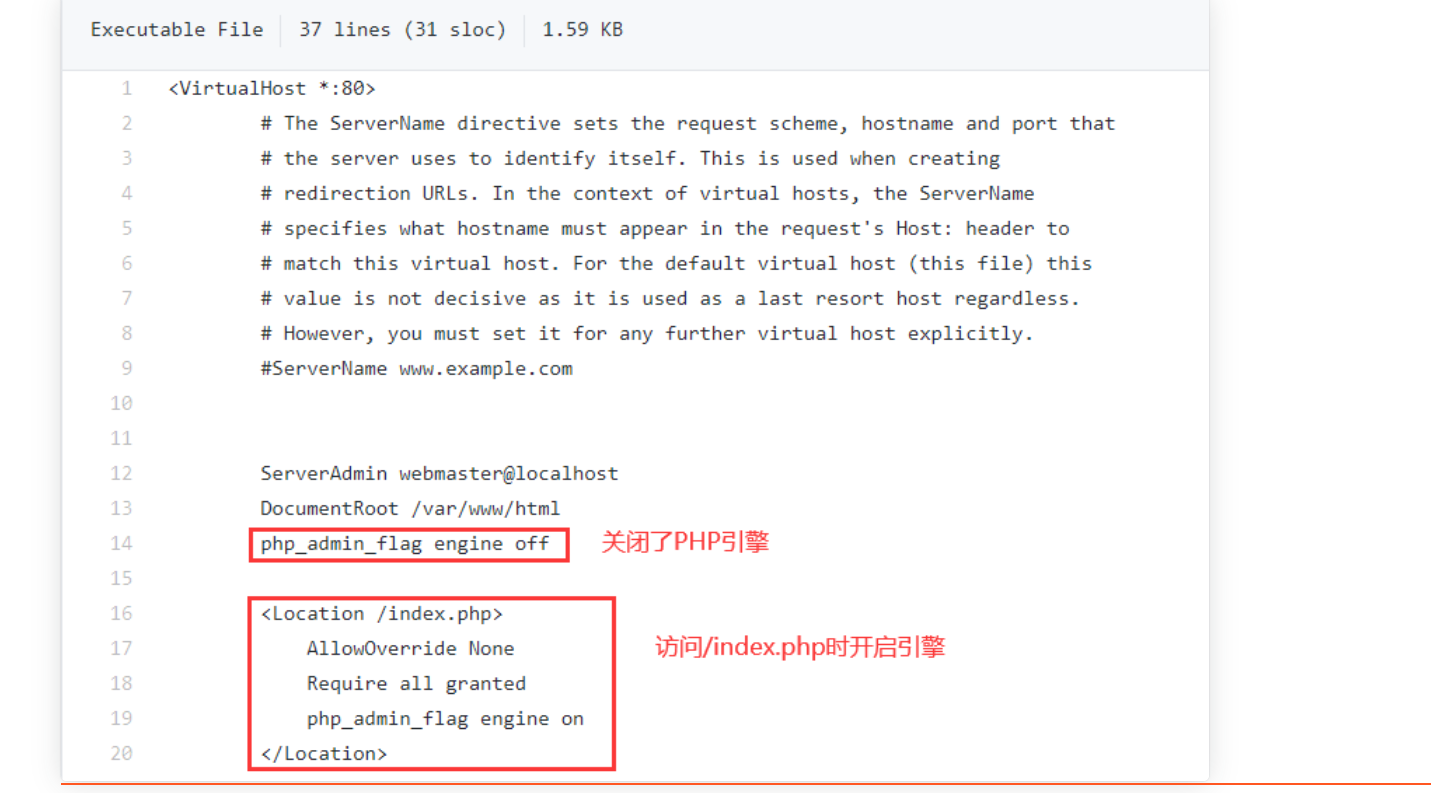 这里尝试了下不能直接传入一句话木马的shell。因为传入的文件不会被正常当成PHP文件来解析。随后在对应的源代码配置中发现,设定了只能访问目录下的index.php时PHP引擎才会开启。