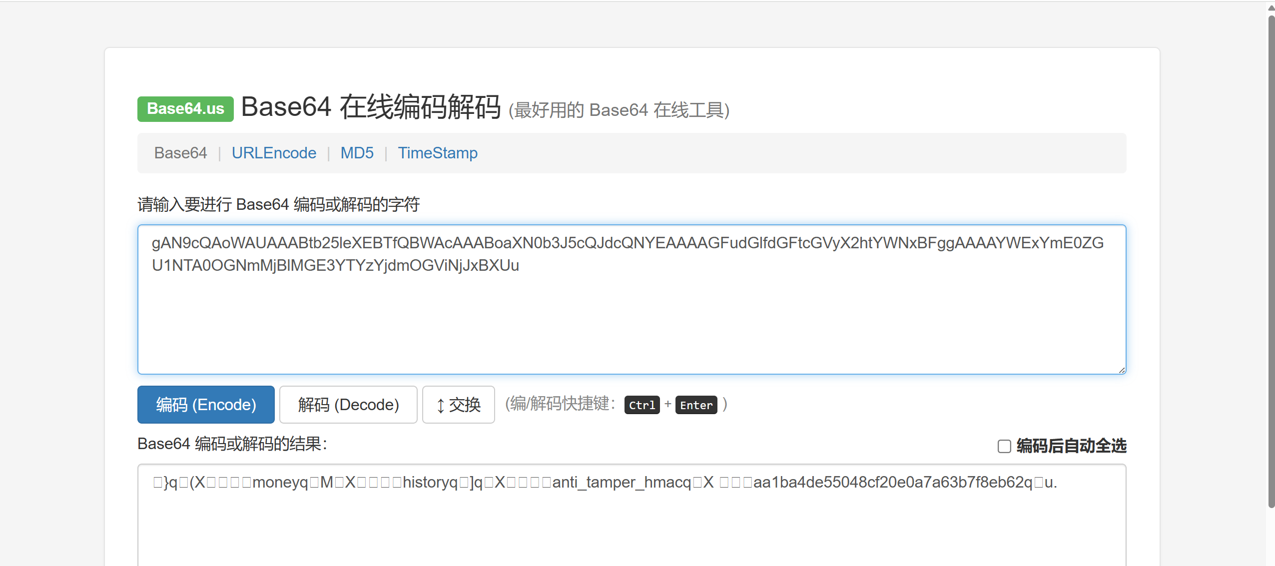 print(pickle.loads(base64.b64decode('gAN9cQAoWAUAAABtb25leXEBTfQBWAcAAABoaXN0b3J5cQJdcQNYEAAAAGFudGlfdGFtcGVyX2htYWNxBFggAAAAYWExYmE0ZGU1NTA0OGNmMjBlMGE3YTYzYjdmOGViNjJxBXUu')))