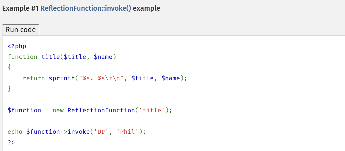 ReflectionFunction的参数就是要调用的函数名,invoke的参数就是被调函数的参数,这个用法和我们的利用思路刚好吻合,invoke不用传参数。